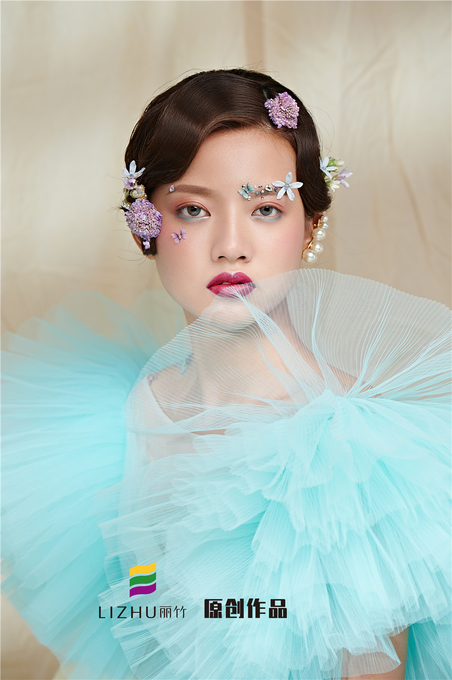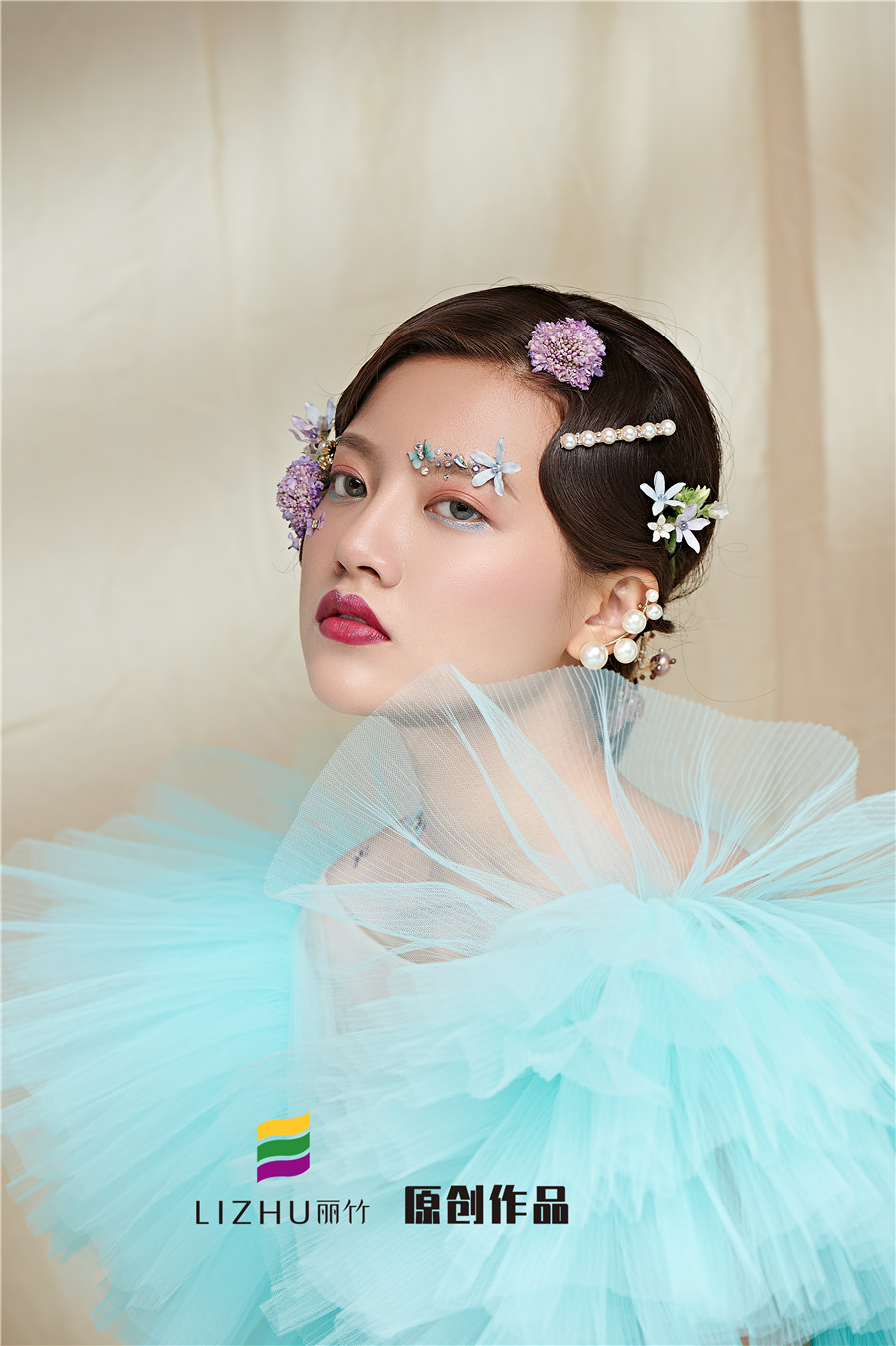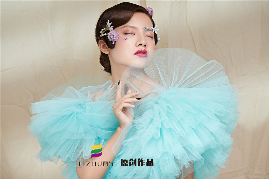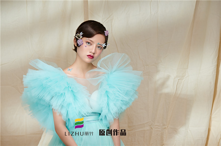 麗竹學(xué)校彩妝作品---氣質(zhì)名媛造型:藍色輕紗加上妝容花朵點綴,頭飾與發(fā)型的完美搭配,流淌出輕柔舒緩之美,簡約自然的情緒態(tài)度。