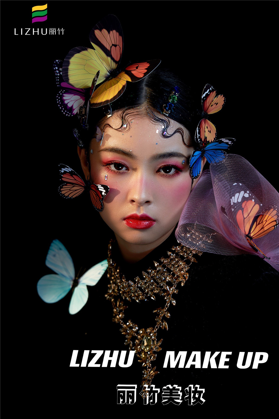 麗竹化妝學校作品---唯美蝴蝶妝容:肩頭兩鬢和眼前額頭,被五彩斑斕的蝴蝶點綴,強烈的黑色背景搭配亮眼色差,產生了很強的視覺效果,讓人過目不忘之余,更寓意破繭成蝶涅槃重生的狀態(tài)。