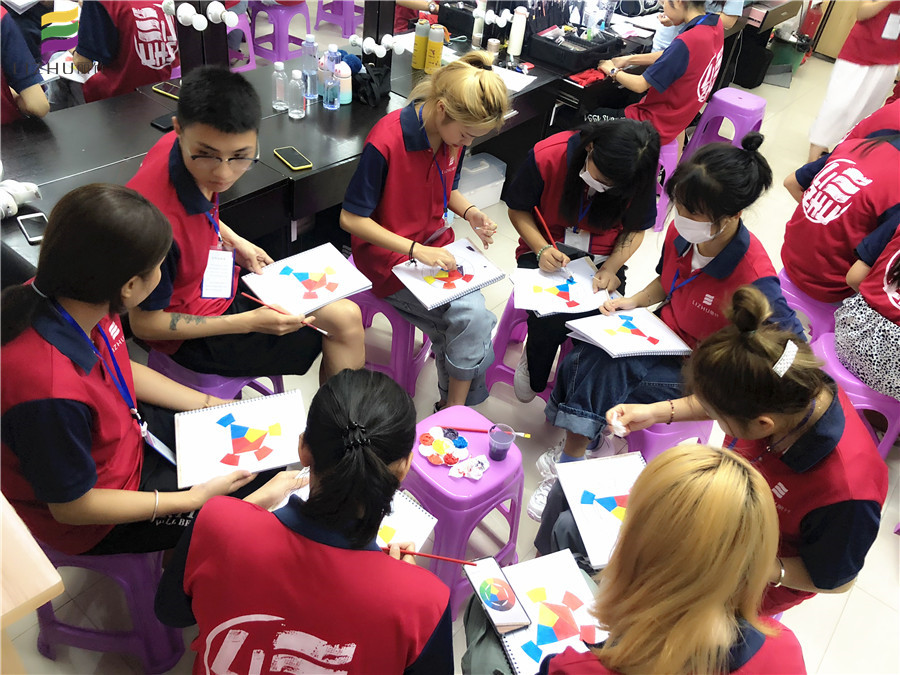 同學們分成幾個小組圍坐在一起,根據(jù)老師上課講解的色彩搭配內(nèi)容,正在互相討論,互相互助進行紙上色彩搭配練習。