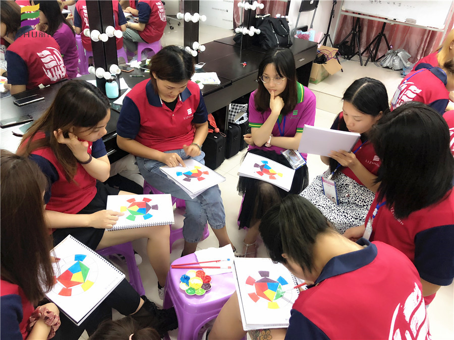 如果你認為這只是簡單在相應的空格里上色,那就錯了。學過彩妝,美甲,美發(fā)的人都知道,色彩分有冷色系和暖色系,在學習色彩搭配的時候,學員必須要對這兩類色調(diào)的顏色分清,同時還要有能進行冷暖色調(diào)進行調(diào)配的能力。而同學們正在做的就是這個練習。