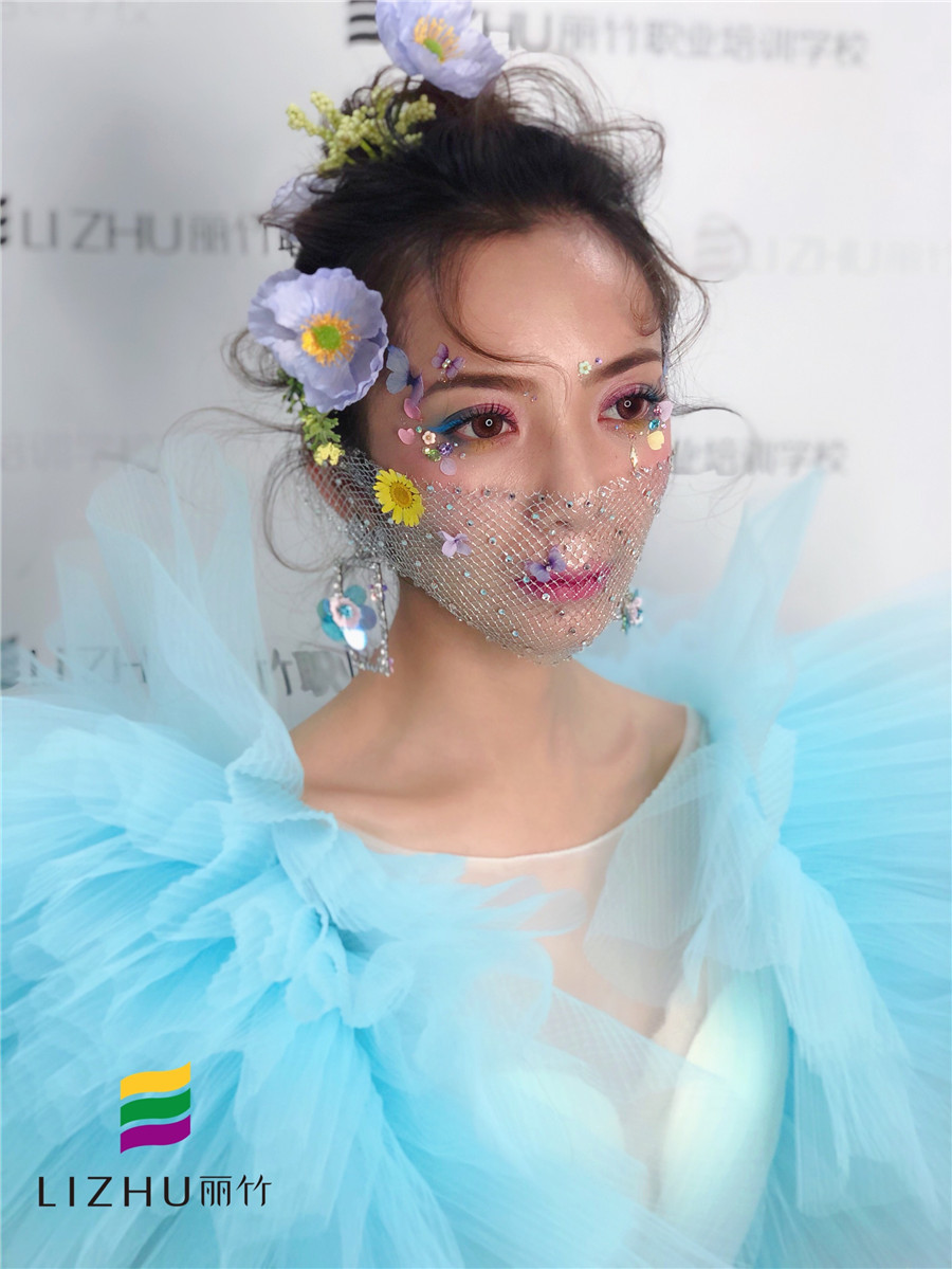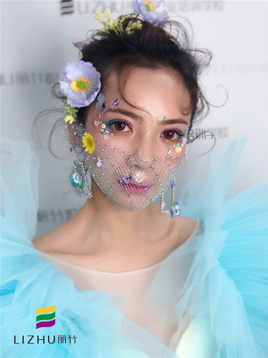 麗竹學校彩妝作品:鮮花面紗新娘造型:鮮花色彩明亮的精致妝容,打造溫潤柔軟的清新格調(diào),佩戴不同的面紗點綴裝飾,閃耀著璀璨的光芒,讓新娘造型更加的唯美浪漫。