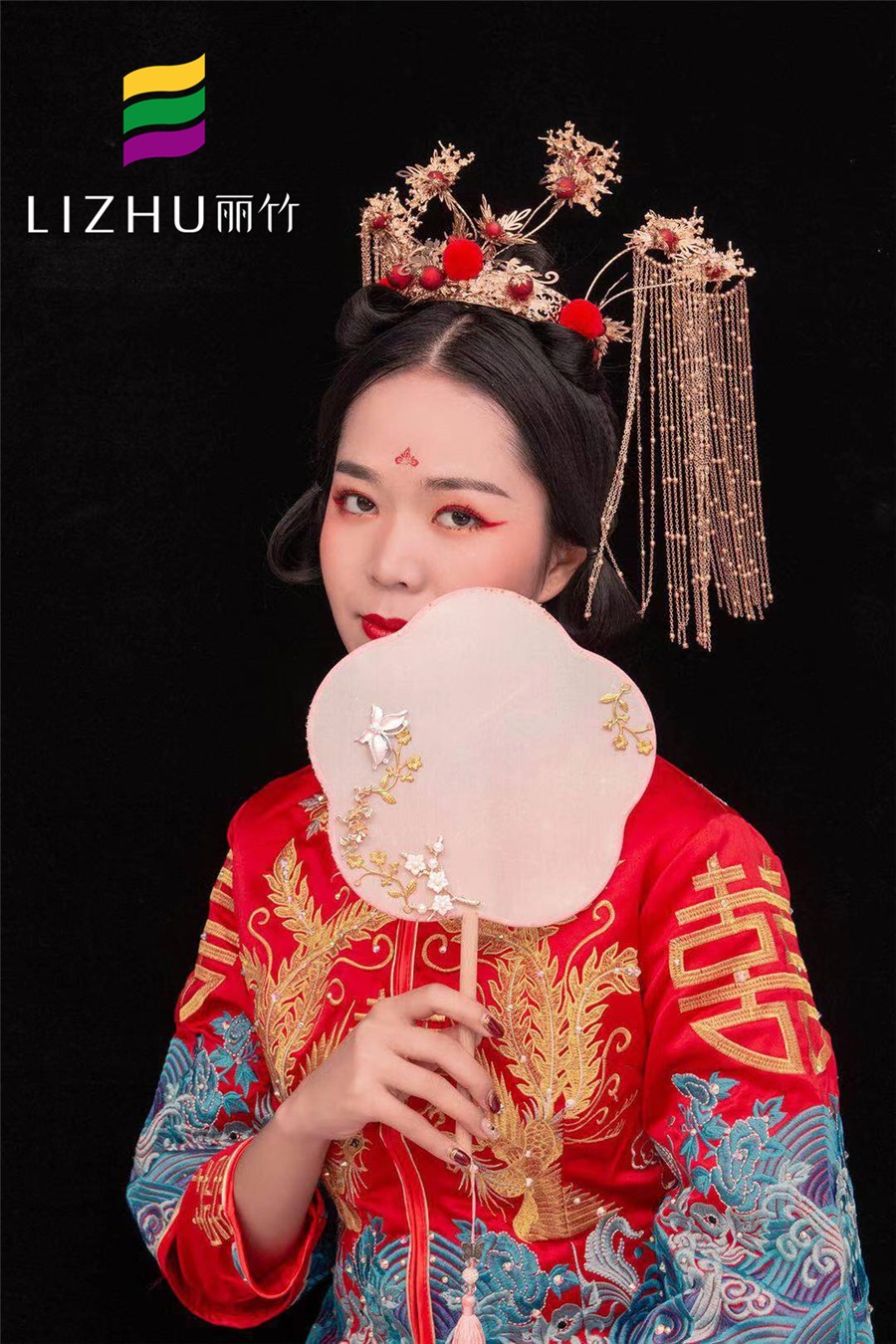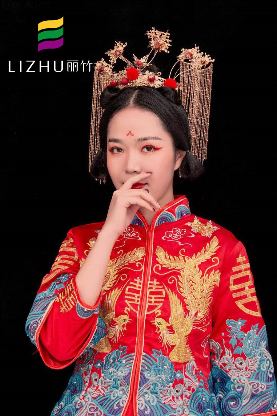 麗竹學(xué)校彩妝作品:中式秀禾新娘造型:端莊喜慶大氣的紅色,配上雍容華貴的金絲秀禾,典雅的妝容更顯新娘儀態(tài)萬千,散發(fā)出濃濃的東方魅力。
