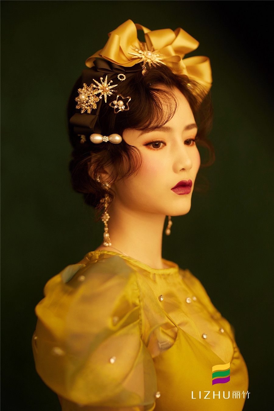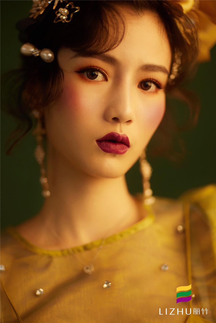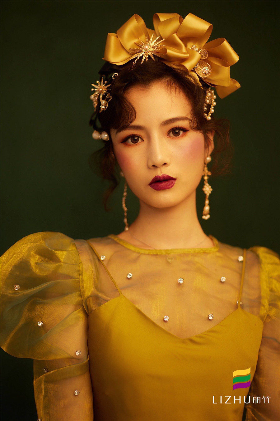 油畫(huà)妝容造型:復(fù)古手推波營(yíng)造的優(yōu)雅感,佩戴金光亮閃的珍珠頭飾,極具張力的色系妝容打造,營(yíng)造出了古典優(yōu)雅韻味,又不可抗拒的文藝氣息,如油畫(huà)里走出來(lái)的女王。