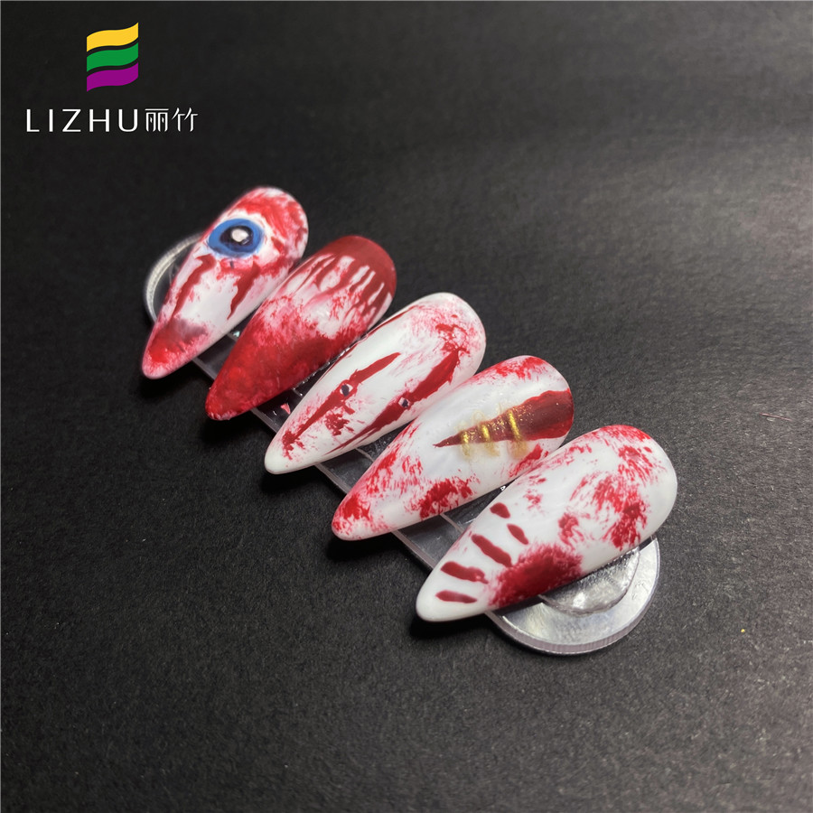 血 跡美甲圖案,白色的底色上面配上血紅色的細絲線,做成血絲的機理,一款適合恐怖角色的美甲圖案哦,什么吸血鬼、惡魔都可以試試。