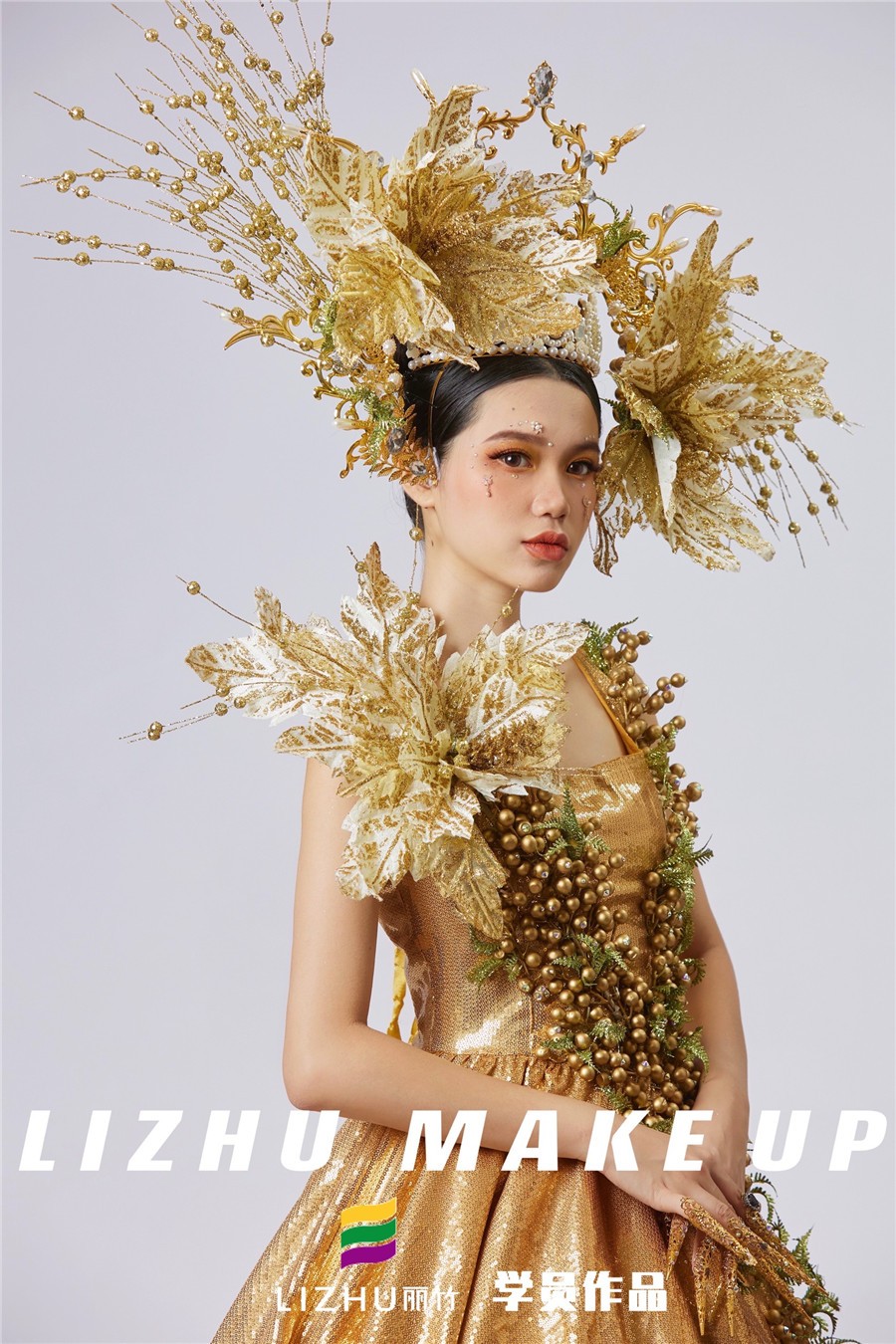 南寧化妝學(xué)校排行榜作品:金色創(chuàng)意妝妝容造型(二)