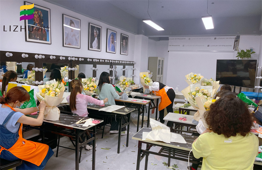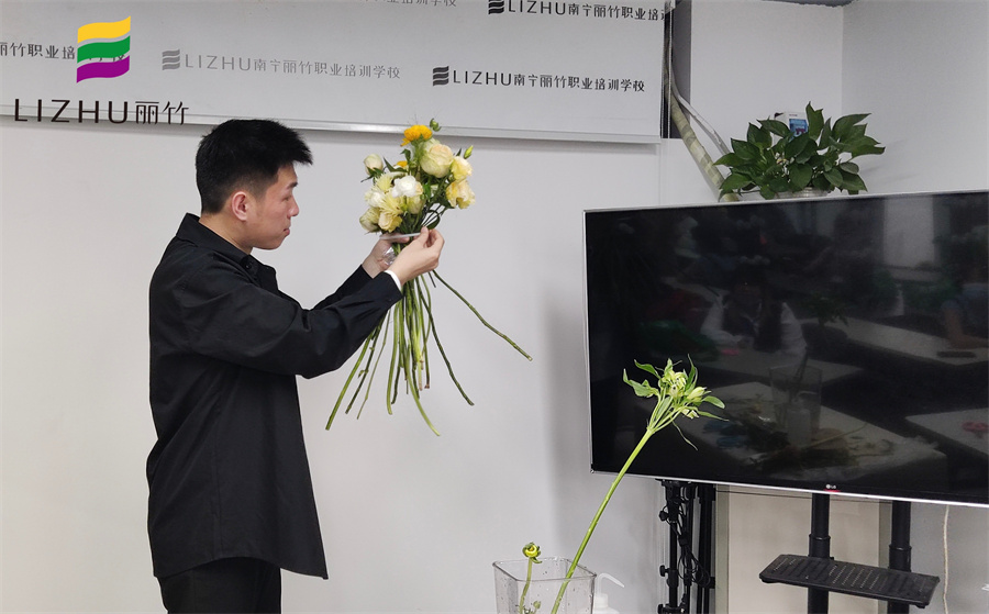 南寧培訓插花基礎(chǔ)、南寧花藝培訓專業(yè):花朵的配色也是決定花束好壞的重要因素之一。在南寧花藝插花培訓學校-麗竹花藝插花培訓學校-南寧花藝學習班課堂上,玉老師正在為學員們講解同色花系的選擇。如果你是零基礎(chǔ)學花藝的小白,想要了解全面且專業(yè)的花束配色知識以及挑選標準,還需要你到南寧花藝師學校去學習,這樣才能學到想要的知識和技術(shù)。