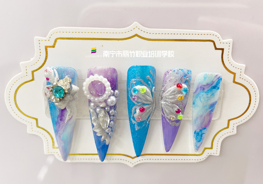 廣西美甲造型培訓(xùn)、廣西美甲:你有想過,當(dāng)你通過零基礎(chǔ)美甲教學(xué)的培訓(xùn)后,把翩翩欲飛的蝴蝶通過美甲技術(shù)定格在你的指尖上時(shí),能有多美嗎?廣西美甲職業(yè)技術(shù)學(xué)校-廣西美甲款式進(jìn)修班-麗竹美甲學(xué)校的同學(xué)們已經(jīng)完成了自己的作品,和我們一起去看看超火爆的蝴蝶美甲吧!