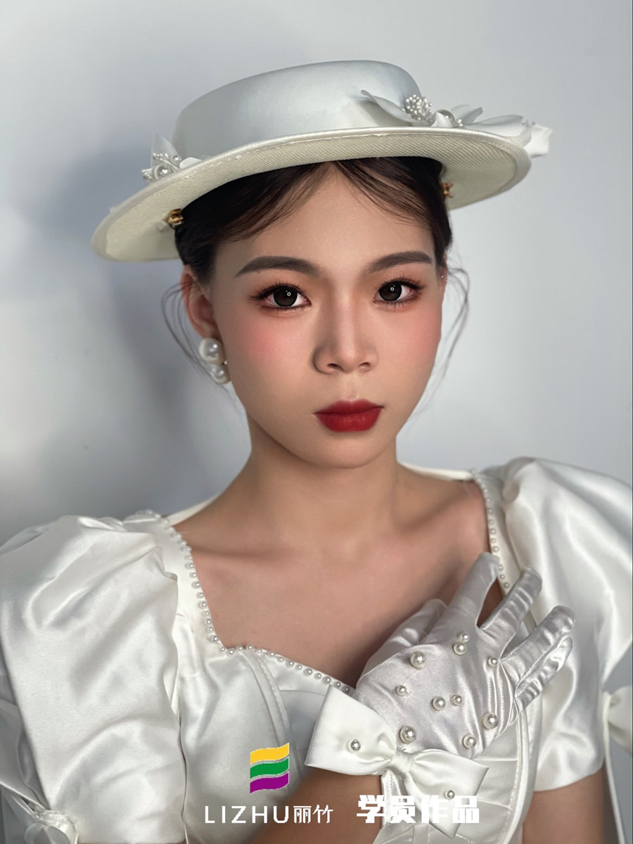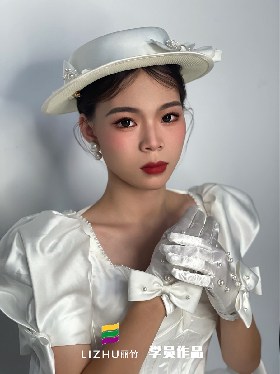 南寧彩妝造型學(xué)習(xí)、南寧新娘跟妝(麗竹彩妝造型)學(xué)員作品---禮帽復(fù)古新娘:大氣簡(jiǎn)潔束起的高發(fā)髻,佩戴珍珠絲綢白色禮帽,腮紅與唇色的色彩碰撞,詮釋法式的浪漫與優(yōu)雅。不管你是在職化妝師,還是想零基礎(chǔ)學(xué)新娘妝的小白,都建議你趁著南寧新娘造型學(xué)校-麗竹化妝學(xué)校進(jìn)行“2025春季春季學(xué)位搶訂活動(dòng)”活動(dòng)之際,狠狠薅一波羊毛!