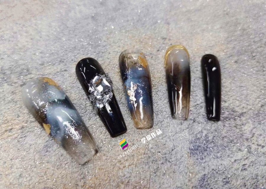 麗竹美甲進(jìn)修班作品:大理石暈染飾品美甲(二)