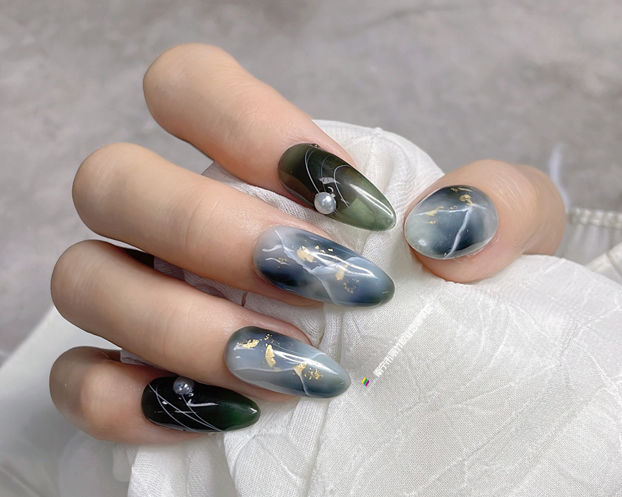麗竹美甲進(jìn)修班作品:大理石暈染飾品美甲(一)