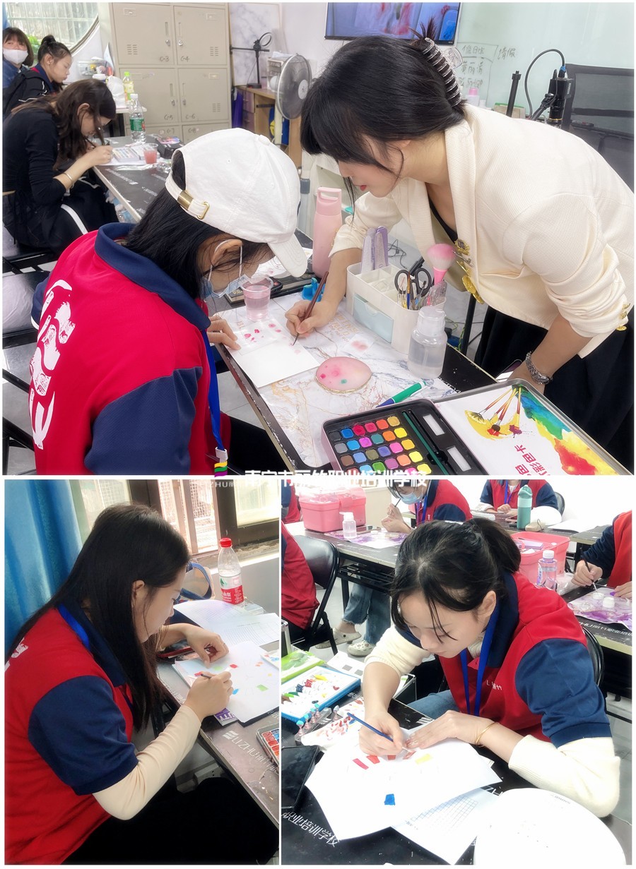 南寧專業(yè)美甲師課程-在小葵老師的教導(dǎo)下,同學(xué)們不僅學(xué)到了美甲暈染的常用方法以及網(wǎng)紅款式,還學(xué)到了水彩的調(diào)色方法(玫瑰花,竹子的畫法),水彩與甲油膠快速暈染技法、以及水彩暈染與彩繪花卉的搭配技法。