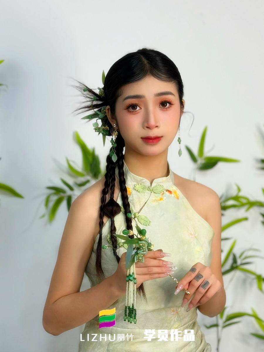 南寧化妝影樓造型、南寧化妝影樓培訓(xùn)(麗竹彩妝寫(xiě)真培訓(xùn))---新中式造型:新中式長(zhǎng)裙復(fù)古迷人,古風(fēng)盤(pán)發(fā)戴翠綠珠釵,綠色搭配竹葉的設(shè)計(jì),給人一種淡雅的感覺(jué)。如果你想學(xué)個(gè)人寫(xiě)真藝術(shù)照造型,或是想在南寧培訓(xùn)寫(xiě)真化妝,學(xué)更加全面的化妝技術(shù),建議你可以趁著麗竹學(xué)校正在進(jìn)行春季招生優(yōu)惠活動(dòng),趕緊聯(lián)系我們報(bào)名吧!