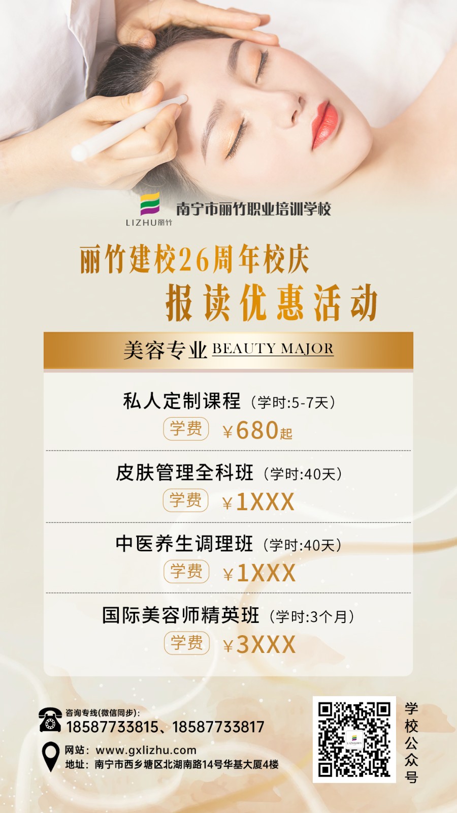 除了眼部的護(hù)理,如果你還對其他美容項(xiàng)目感興趣,或是想從事美容相關(guān)工作,建議現(xiàn)在就趕緊參加南寧美容師正規(guī)培訓(xùn)(麗竹美容學(xué)校)的26周年校慶報讀優(yōu)惠活動,享親民價格,學(xué)專業(yè)美容技術(shù)吧!
