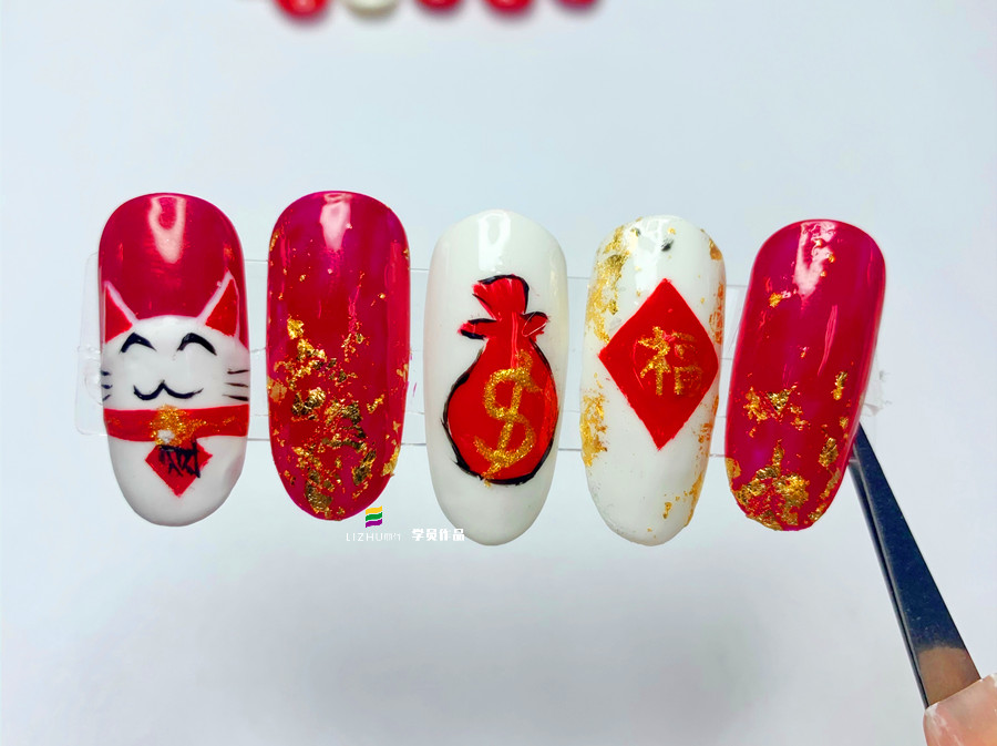 從零開始學美甲、廣西美甲學徒:用喜慶的紅色和金色相互搭配,滿滿的吉祥喜氣,招財進寶之意撲面而來。如果你也想繪制招財貓美甲,不如就跟著廣西專業(yè)正規(guī)美甲學校(麗竹美甲培訓)的同學們一起學習下新年招財貓美甲教程吧!