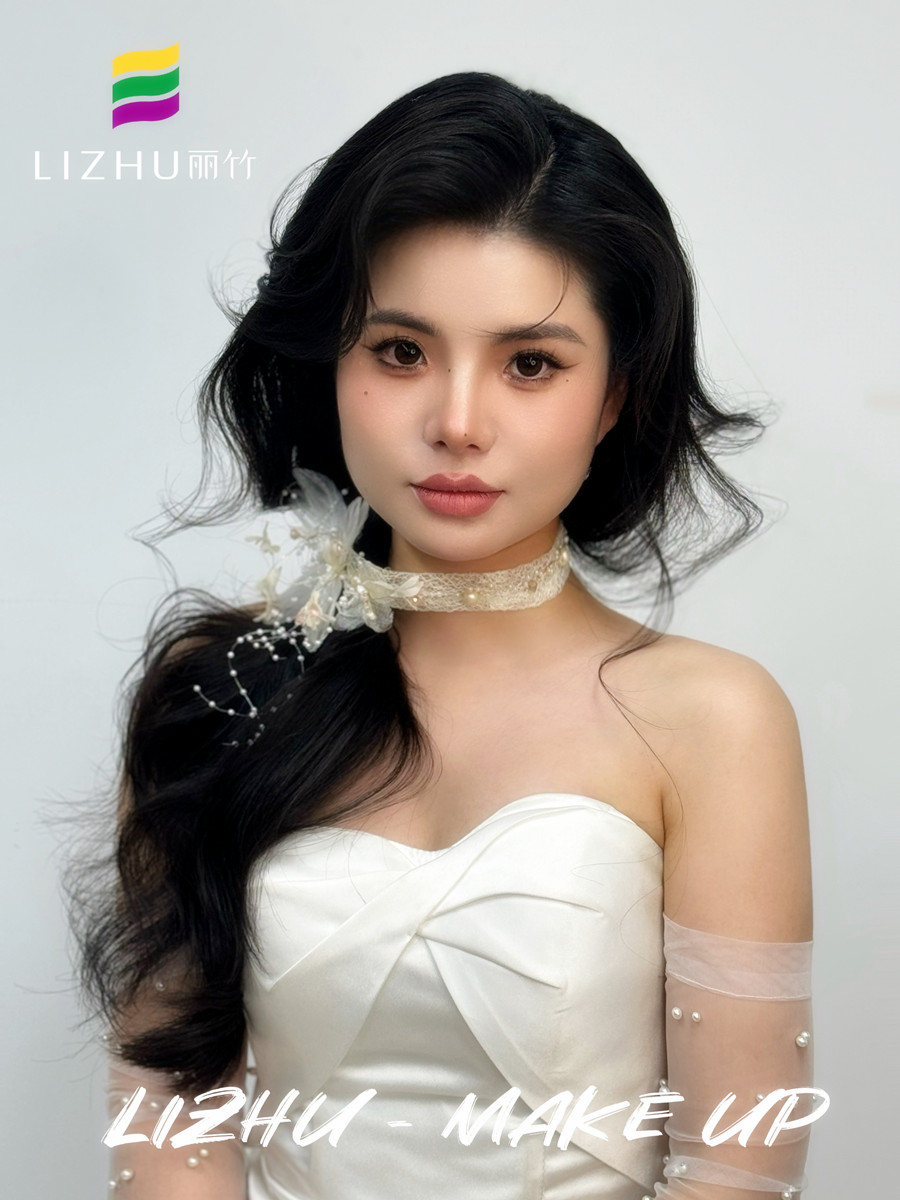 廣西學(xué)化妝影樓、廣西寫(xiě)真化妝,廣西新娘妝跟妝培訓(xùn)(麗竹寫(xiě)真化妝培訓(xùn))--- 韓式側(cè)扎紋理新娘:氧氣清新的自然無(wú)痕妝容,優(yōu)雅隨意的紋理韓式卷發(fā),白色蕾絲珠花頭飾側(cè)扎發(fā),打造氣質(zhì)滿(mǎn)滿(mǎn)的元?dú)饷郎倥?