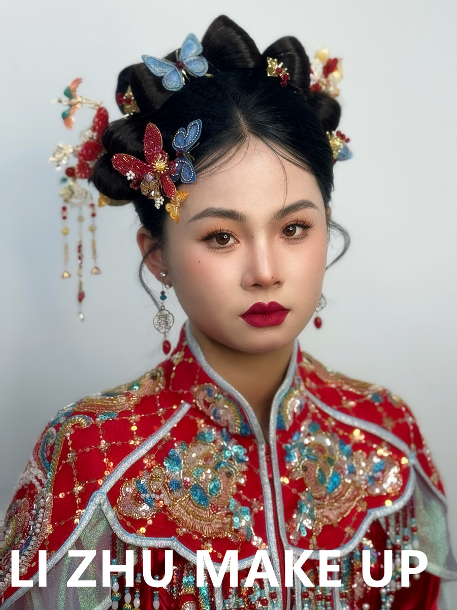 廣西學新娘妝、廣西新娘妝跟妝:明艷動人的底妝,亮眼的紅唇描繪彰顯氣場,中式卷筒發(fā)髻,配上寓意喜慶和美好的珠釵花朵蝴蝶發(fā)飾,穿上采用傳統(tǒng)紅色作為主色調之余,配以不同色系的亮片鑲嵌在衣服上,肩膀使用披肩設計點綴,使得整個造型更加精致和吸睛。