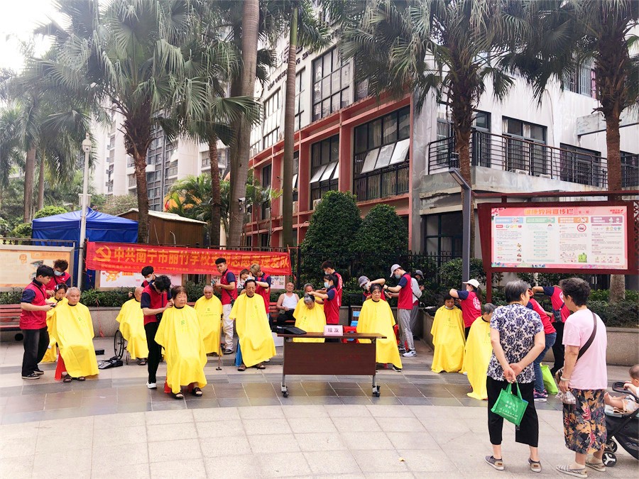 2023年5月26日,南寧美發(fā)培訓(xùn)班志愿者們?yōu)榻先A府小區(qū)居民進(jìn)行理發(fā)活動
