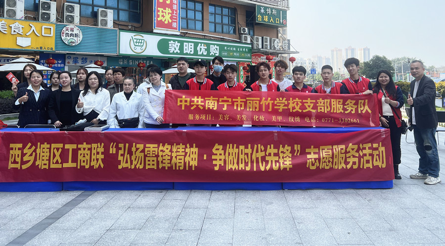 中共南寧市麗竹學(xué)校支部服務(wù)隊(duì),積極響應(yīng)在石埠街西明商業(yè)廣場(chǎng)舉行的南寧市西鄉(xiāng)塘區(qū)工商聯(lián)“弘揚(yáng)雷鋒精神·爭(zhēng)做時(shí)代先鋒”活動(dòng),為群眾提供義剪服務(wù)。