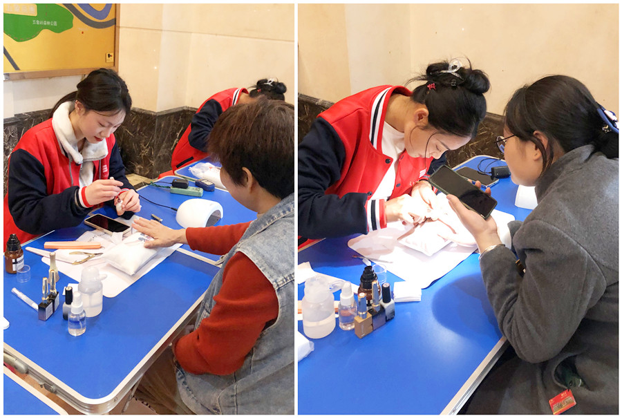 活動當天,同學們雖然只為居民提供了簡單的修手,修剪死皮,打磨甲型,甲面護理以及進行單色涂抹,但大家并沒有因此就變得怠慢。面對居民的需求,大家細心對待,用專 業(yè)技術去服務每一個居民,讓她們感受美甲技術的魅力。