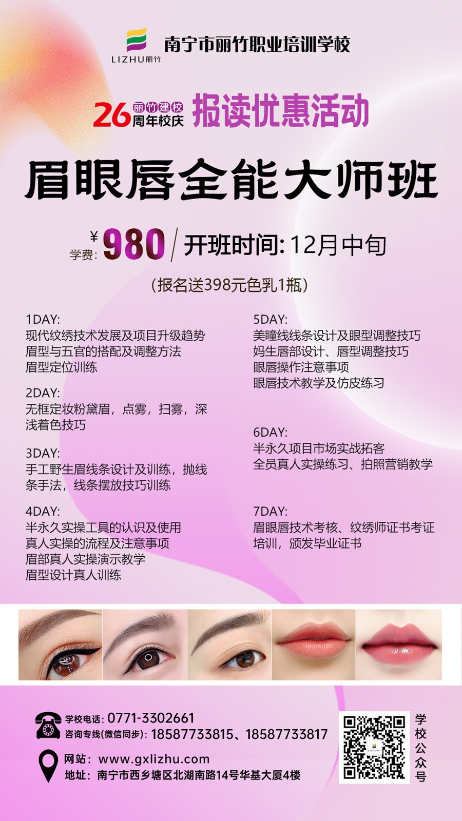年前給自己一個(gè)快速學(xué)習(xí)一門技術(shù)的機(jī)會(huì),抓住今年的尾巴,為新一年的到來(lái)開(kāi)個(gè)好頭。南寧紋繡師培訓(xùn)-麗竹學(xué)校12月紋繡全能班(眉眼唇全能大師班)啟動(dòng)開(kāi)班招生中,現(xiàn)在報(bào)名僅需980元,還能額外贈(zèng)送398元色乳1瓶。想在南寧學(xué)紋繡的小伙伴,趕緊聯(lián)系我們報(bào)預(yù)定學(xué)習(xí)名額的吧!