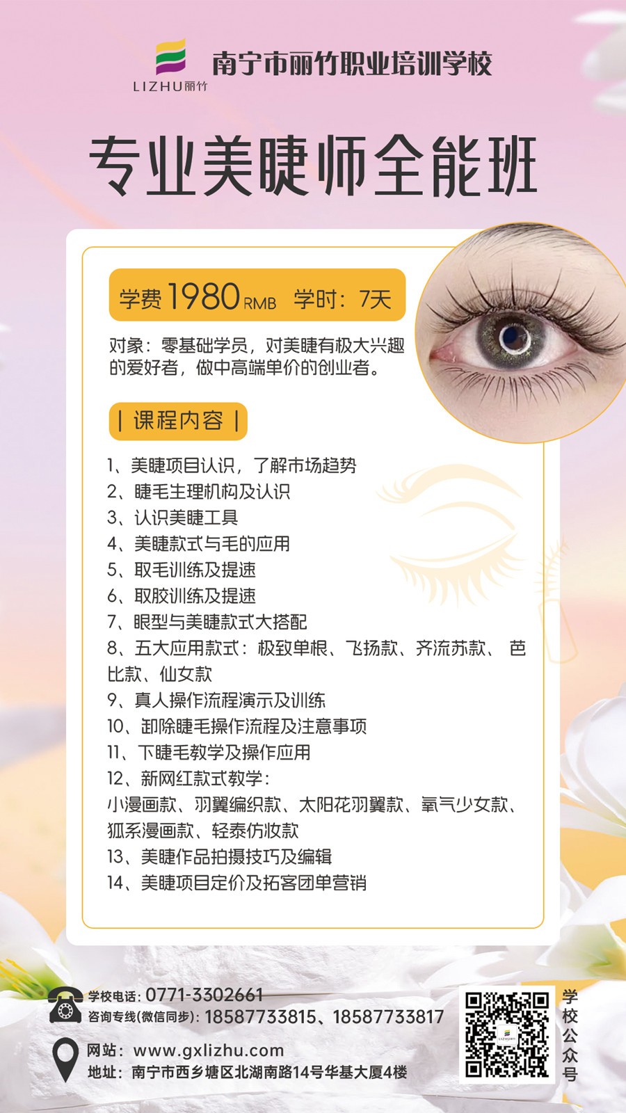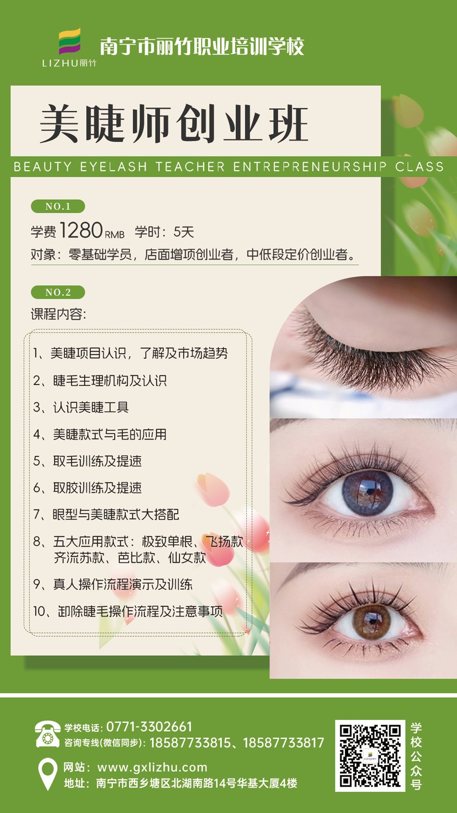 南寧美睫師、零基礎(chǔ)學(xué)美睫:寧美睫培訓(xùn)學(xué)校-麗竹學(xué)校美睫課程教學(xué)技術(shù)成功全面升級!美睫學(xué)費(fèi)優(yōu)惠活動持續(xù)進(jìn)行,截止日期為5月30日。如果你想在南寧學(xué)美睫,想做南寧美睫培訓(xùn)學(xué)費(fèi)哪里便宜?那現(xiàn)在就不要猶豫,趕緊聯(lián)系我們報名吧!拼手速的時候就是現(xiàn)在。畢竟,你還在猶豫不決時,別人已經(jīng)開始行動了。