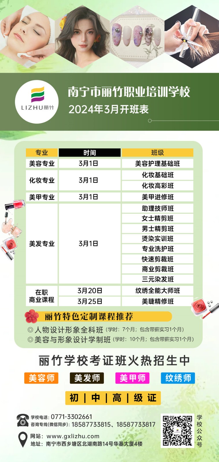 如果你想學(xué)習(xí)美業(yè)技術(shù),想在廣西零基礎(chǔ)學(xué)美容美發(fā)?想知道廣西化妝美甲培訓(xùn)在哪里?廣西哪里學(xué)紋繡專業(yè)?同時(shí)還想到廣西美睫學(xué)校去學(xué)美睫?那么,請(qǐng)你千萬(wàn)不要錯(cuò)過(guò)廣西美業(yè)專業(yè)職業(yè)學(xué)校-麗竹學(xué)校3月的開班安排了啦!早學(xué)早就業(yè),就能早點(diǎn)實(shí)現(xiàn)人生目標(biāo)。